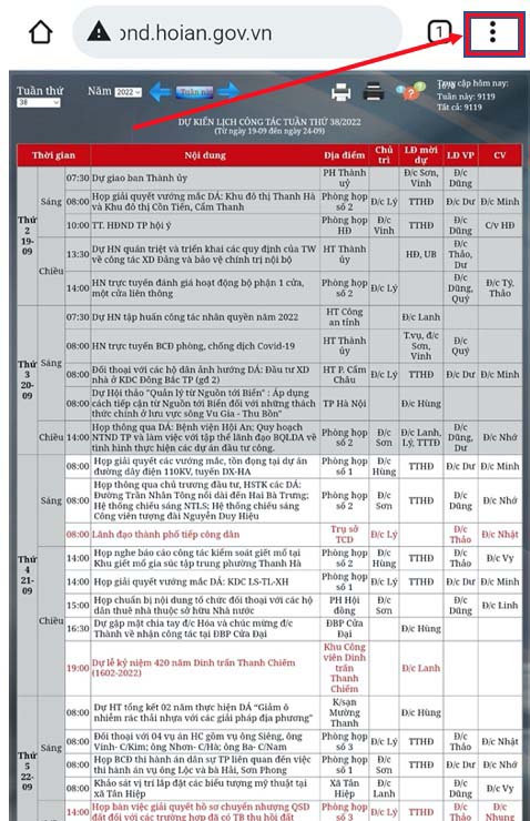 | Thời gian | Nội dung | Địa điểm | Chủ trì | LĐ mời | LĐ VP | CV | TL | ||