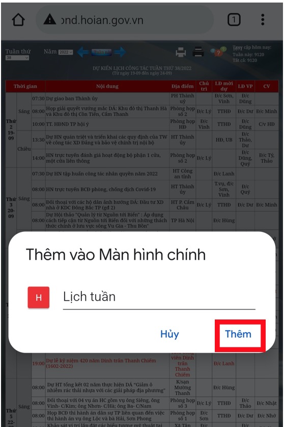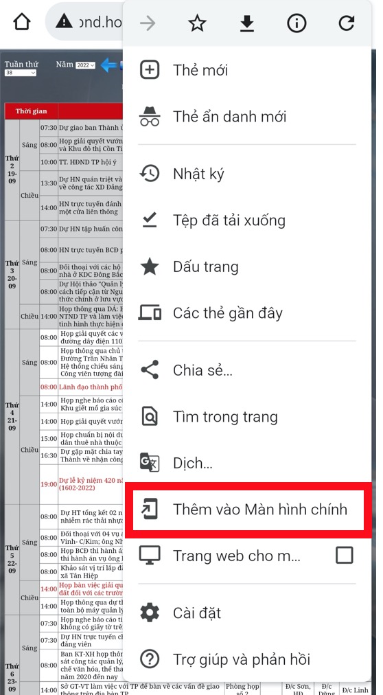 Bước 1: Mở lịch tuần trên Google Chrome. Nhấn vào biểu tượng dấu ba chấm > Thêm vào màn hình chính > Thêm.