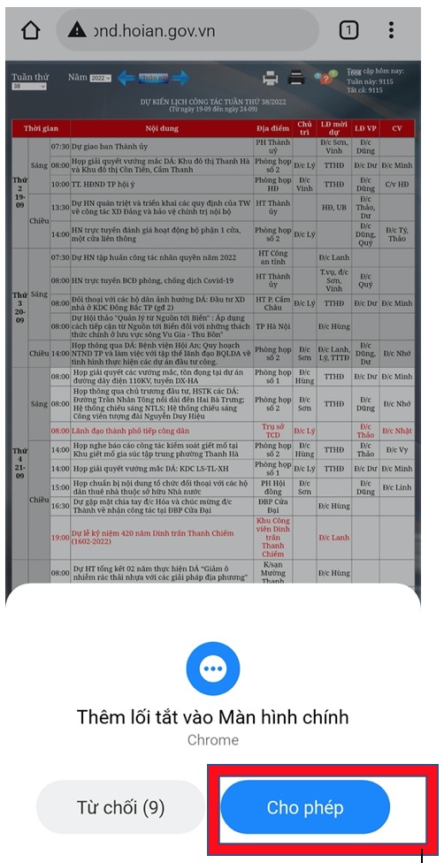 Bước 2: Tiếp tục, xác nhận "Cho phép". Sau đó, khi ra ngoài màn hình chính bạn sẽ thấy biểu tượng được thêm vào màn hình. Từ bây giờ để truy cập trang web này thì bạn chỉ cần bấm vào biểu tượng này là được.