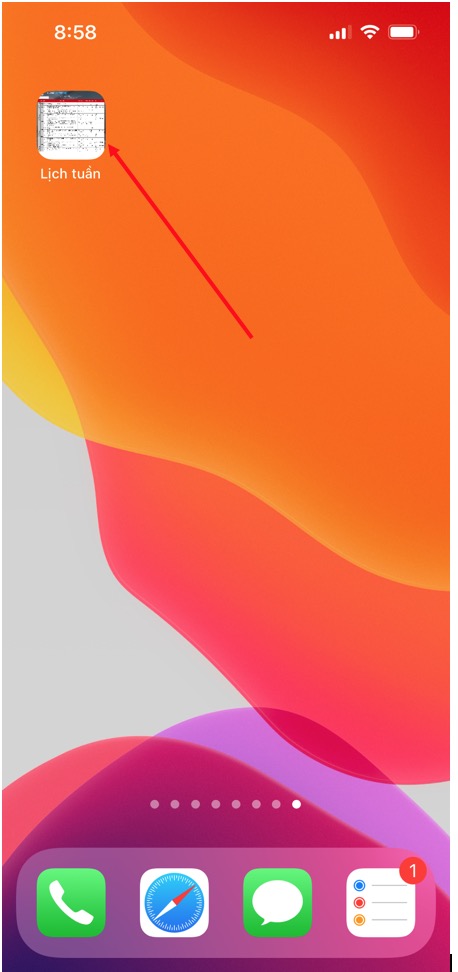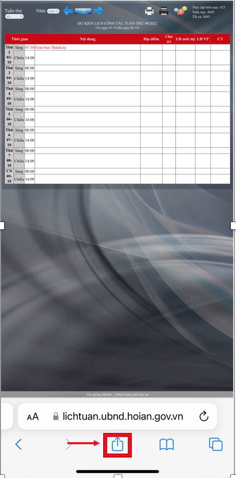 Bước 1: Chạy đường dẫn lịch của đơn vị (ví dụ: https://lichtuan.tabnext.vn/hoian) từ trình duyệt Safari. Bấm vào nút như hình dưới.