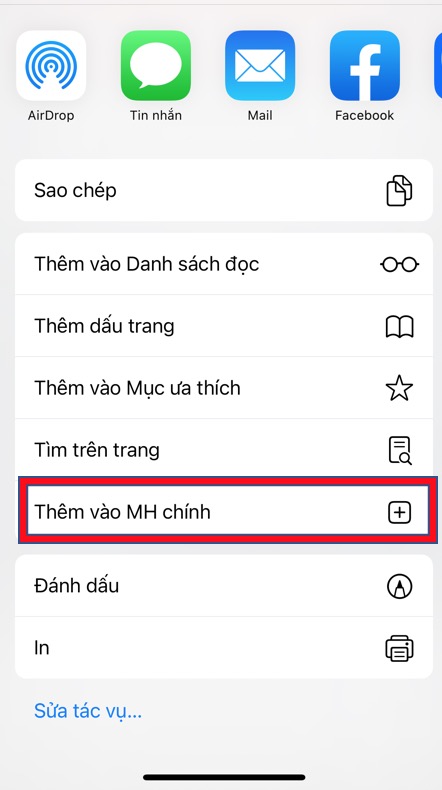 Bước 2: Kéo xuống và chọn mục "Thêm vào MH chính" và bấm Ok, biểu tượng của ứng dụng sẽ được đưa ra màn hình iphone.